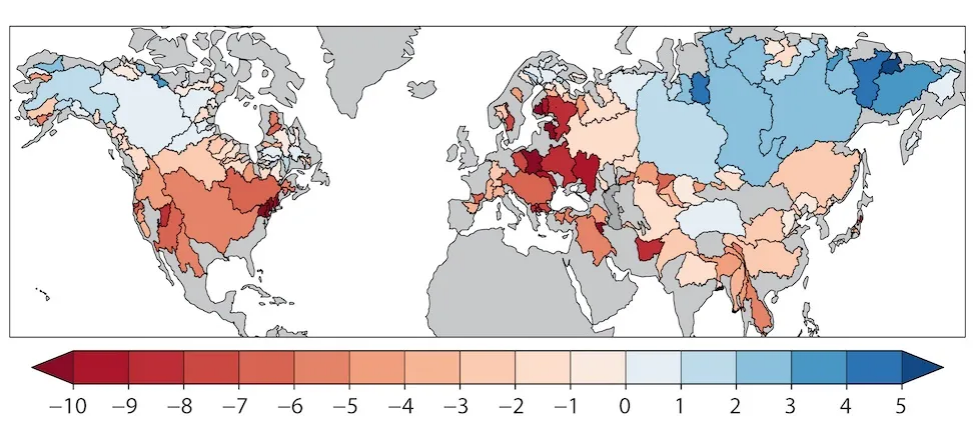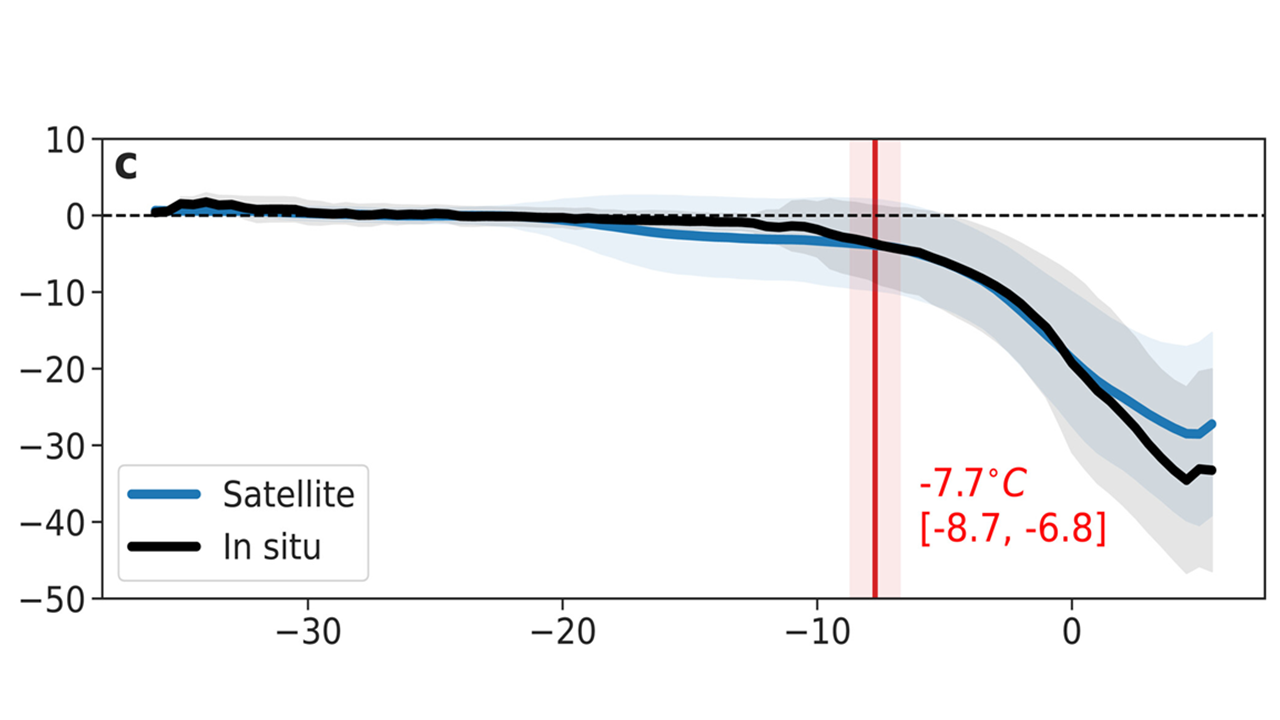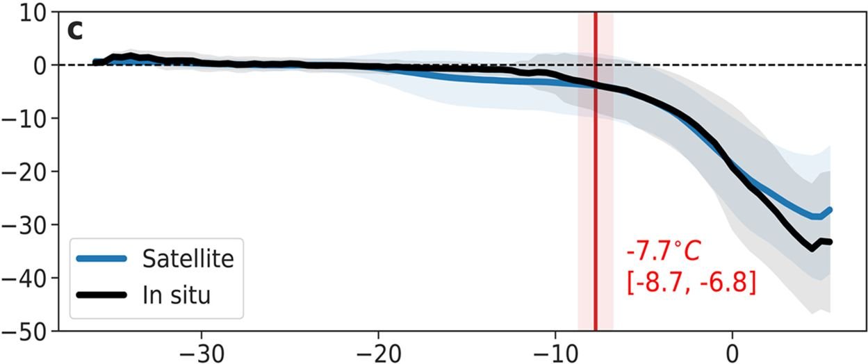 Citlivost trvání sněhové pokrývky na klimatologickém průměru teploty za listopad až březen. Svislá červená čára označuje bod zlomu, ve kterém se citlivost začíná s teplotou zvyšovat