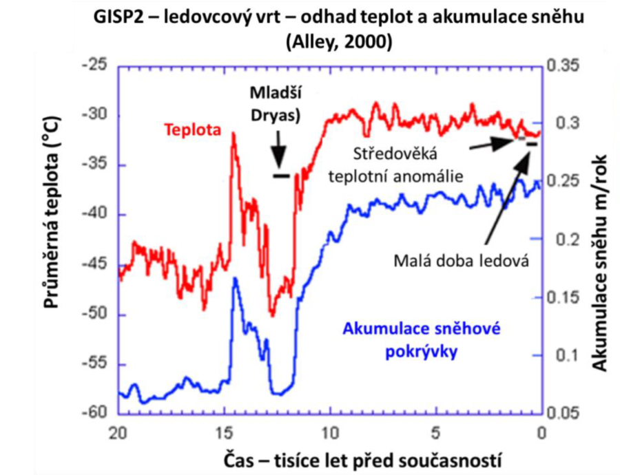 Rekonstrukce teploty vzduchu (levá osa) a akumulace sněhu v metrech za rok (pravá osa) z ledovcového vrtu ve středním Grónsku za posledních 20 tisíc let (vpravo rok 2000) - patrné jsou výrazné výkyvy před 15 až 10 tisíci lety, zdroj: klimatickazmena.cz a NOAA