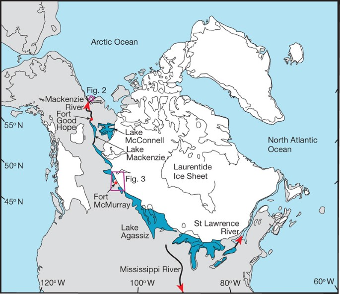 Severní Amerika před nástupem chladného období mladšího dryasu. Bíle je označena plocha ustupujícího kontinentálního ledovce. Při jeho okrajích se vytvořila rozsáhlá jezera (Agassiz je přibližně uprostřed mapy), která se zhroutila a jejich voda rychle odtekla do okolních oceánů, zdroj: nature.com