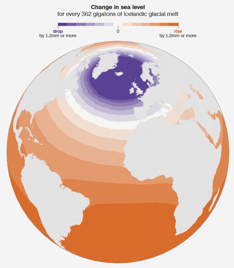 Změna výšky hladin oceánů při roztání každých 362 gigatun ledu na Islandu - v oblasti ostrova to povede k poklesu hladiny oceánů, ve vzdálenějších oblastech naopak k růstu
