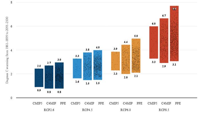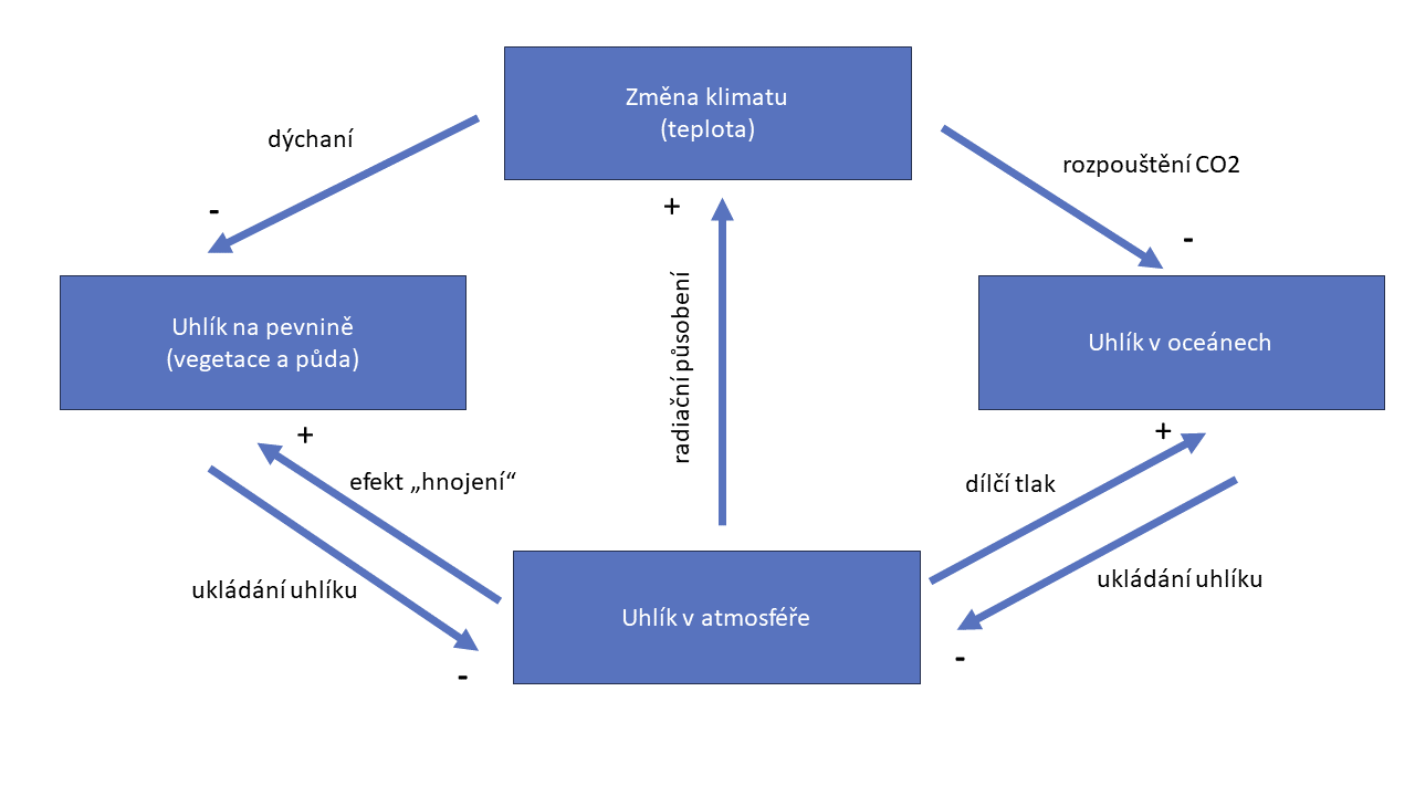 Zjednodušené znázornění zpětných vazeb uhlíkového cyklu a jejich efekt na ukládání uhlíku v půdě a oceánech. „+“ znamená, že daný efekt s rostoucí koncentrací uhlíku v atmosféře zesiluje,„-“ že zeslabuje. Například vyšší koncentrace uhlíku v atmosféře obecně vede ke zvýšenému příjmu rostlinami (lépe prosperují), naopak efektivita rozpouštění CO2 v oceánech klesá s rostoucí teplotou (která roste se zvyšováním koncentrací CO2 v atmosféře) a s rostoucí koncentrací CO2 v atmosféře.
