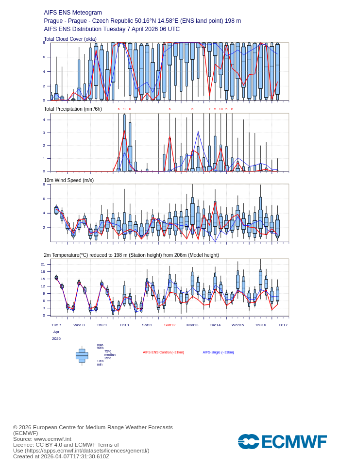 Ukázka ansámblové předpovědi počítaná metodou "AI" z Evropského centra pro uzlový bod odpovídající Praze
