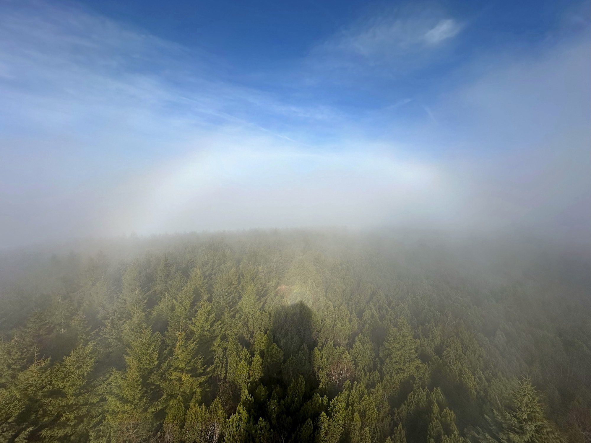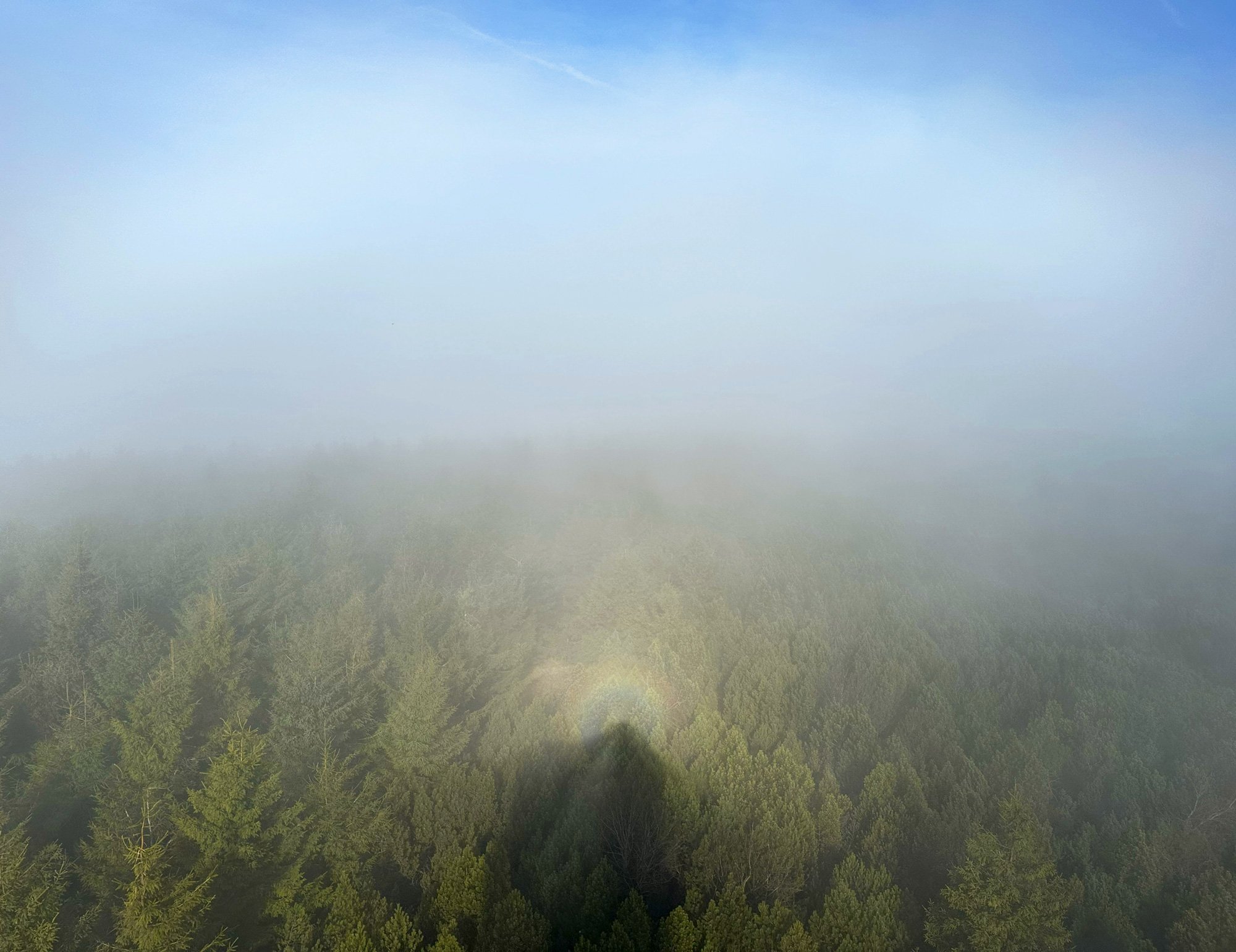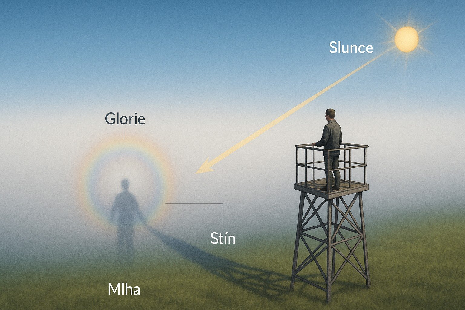 Velká Deštná v Orlických horách 1. listopadu 2025 - vrchol rozhledny tvoří výrazný stín a pozorovatel, který na rozhledně stojí, kolem stínu může pozorovat tzv. gloriolu. Barevné prstence jsou souměrně kolem vrcholu stínu rozhledny, na které stojíme – protože to je geometrický střed oblasti, odkud světlo přichází zpět k našim očím.