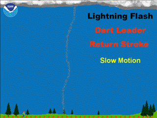 Obr. 5: Šípový výboj (dart leader) a následný zpětný výboj, zdroj: Lightningsafety.noaa.gov