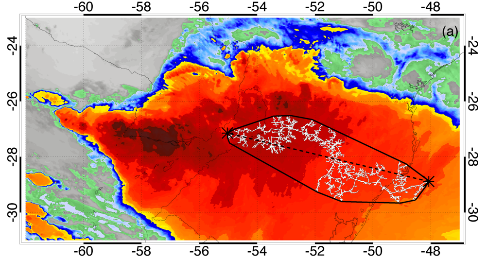 Satelitní snímek rekordně dlouhého blesku z 31. října 2018 - vyskytl se v rozsáhlém bouřkovém oblaku