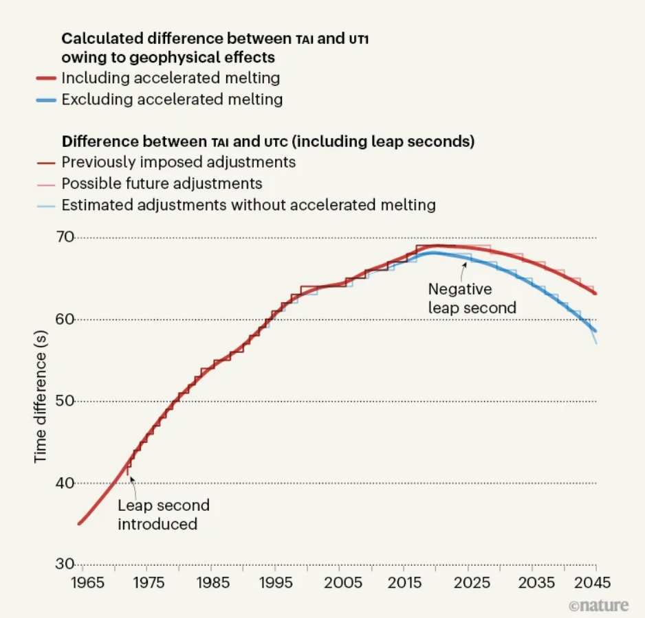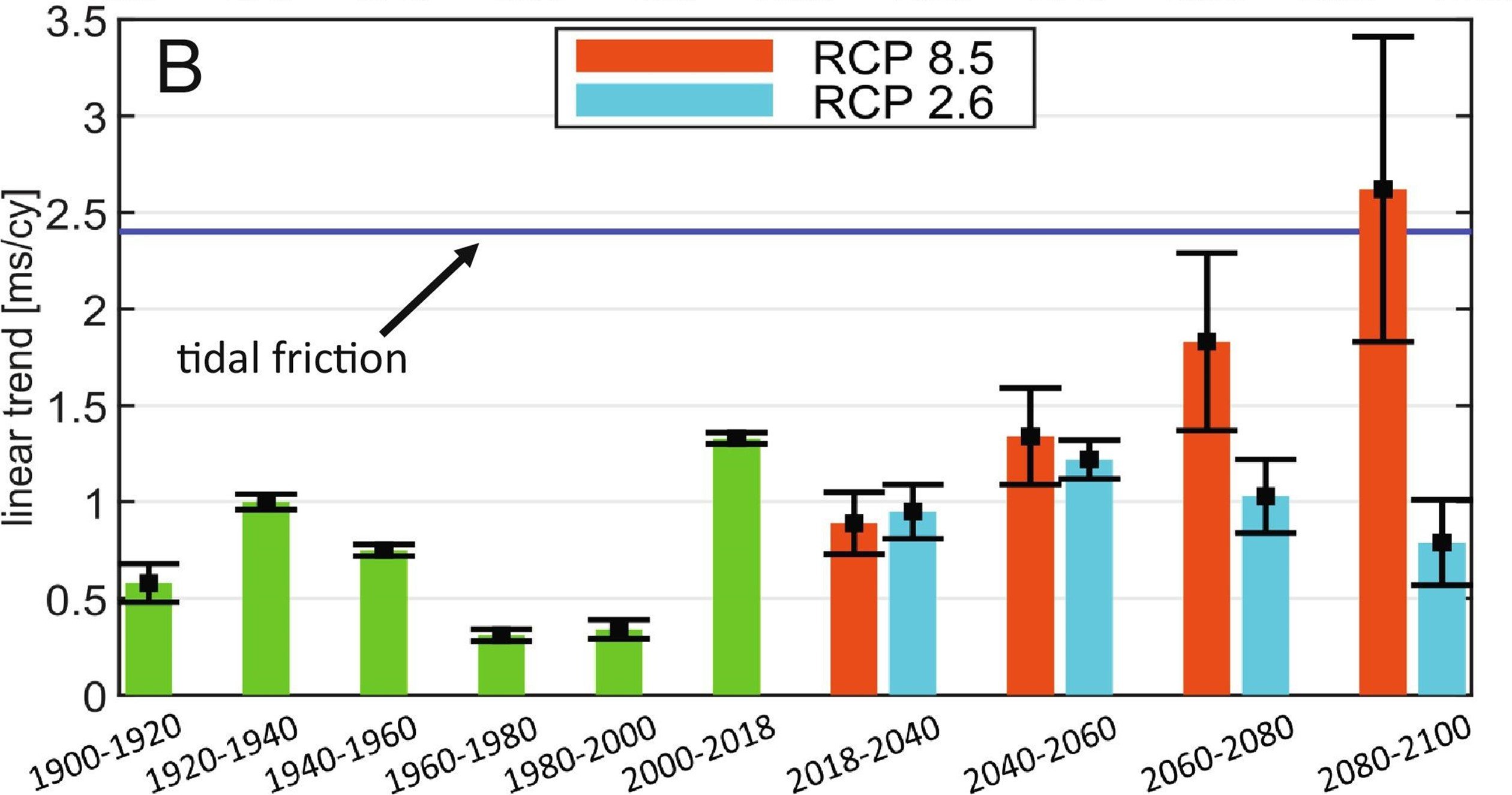 Vliv vody z tajících ledovců na zpomalování rotace Země v milisekundách. Lineární trend pro minulá i budoucí dvacetiletí (očekávaný výhled podle emisních scénářů RCP 2.6 (směřující k rychlejšímu omezení emisí) a RCP 8.5 (bez výraznějšího omezování emisí))