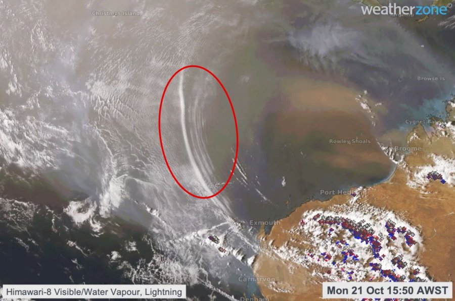 Gravitační vlny se postaraly o vznik oblačných souběžných pásů u břehů severozápadní Austrálie (patrné jsou v centrální části snímku - červeně označené), zdroj: weatherzone.com.au