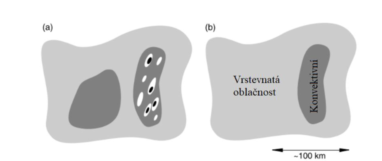 Typická podoba mezoměřítkového konvektivního systému na radarových snímcích (vlevo) a rozdělení na konvektivní a vrstevnatou oblačnost (vpravo) – systém postupuje zleva doprava, zdroj: Arnoštová, M.: Aktivita blesků v Česku v oblastech MCS, Bakalářská práce, 2020