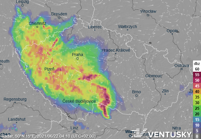 Mezoměřítkový konvektivní systém nad Českem v noci z pondělí na úterý 22. 6. 2021 - na čele jsou silné bouřky, v zadní části naopak trvalé srážky, zdroj: ventusky.com