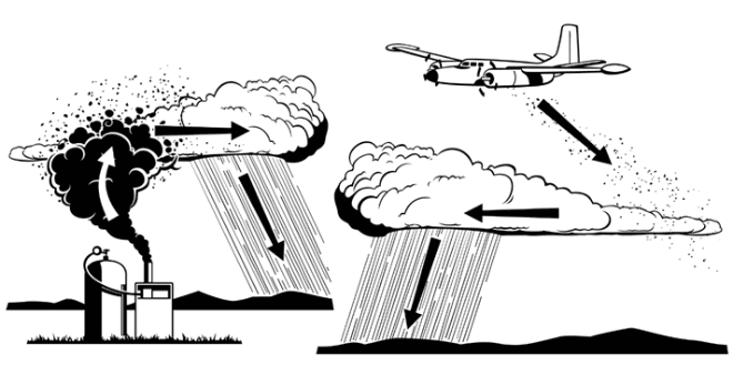 Dalším typem umělých zásahů do oblaků souvisí s požadavkem na vyvolání srážek. V našich zeměpisných šířkách lze využít faktu, že významné srážky vypadávají výlučně ze smíšených oblaků (obsahujících ledové částice a kapičky přechlazené vody). Je-li v oblaku přítomna jen přechlazená voda, pak umělým vpravením krystalků jodidu stříbrného do oblaku vyvoláme de facto srážkotvorný proces. Částice s jodidem stříbrným pak narůstají na úkor vody, až následně začnou padat k zemi ve formě srážek z oblaku, který by jinak srážky nepřinesl. Podobným způsobem je možné vyvolat rozpuštění mlhy při teplotách pod nulou, kdy se mlha takzvaně vyprší (nebo spíš vymrholí).Oteplení vzduchu