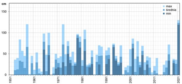 Maximální, průměrná a minimální (dle odstínu modré) výška sněhové pokrývky v první dekádě května na Sněžce v letech 1951-2021 - v roce 2021 tu dosáhla rekordu, zdroj: obserwator.imgw.pl