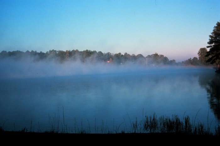 Schéma vzniku radiační mlhy. Přiložené grafy ukazují vertikální průběh teploty, kdy na ose x je teplota a na ose y je výška