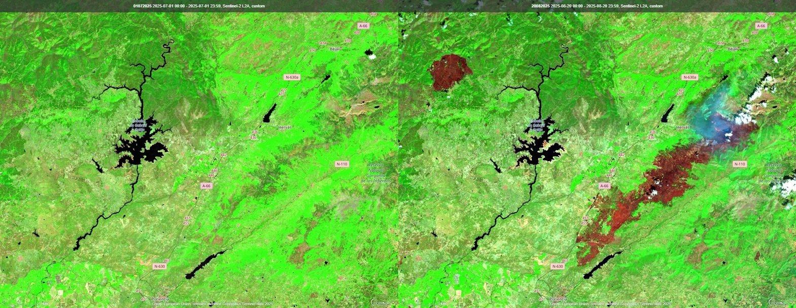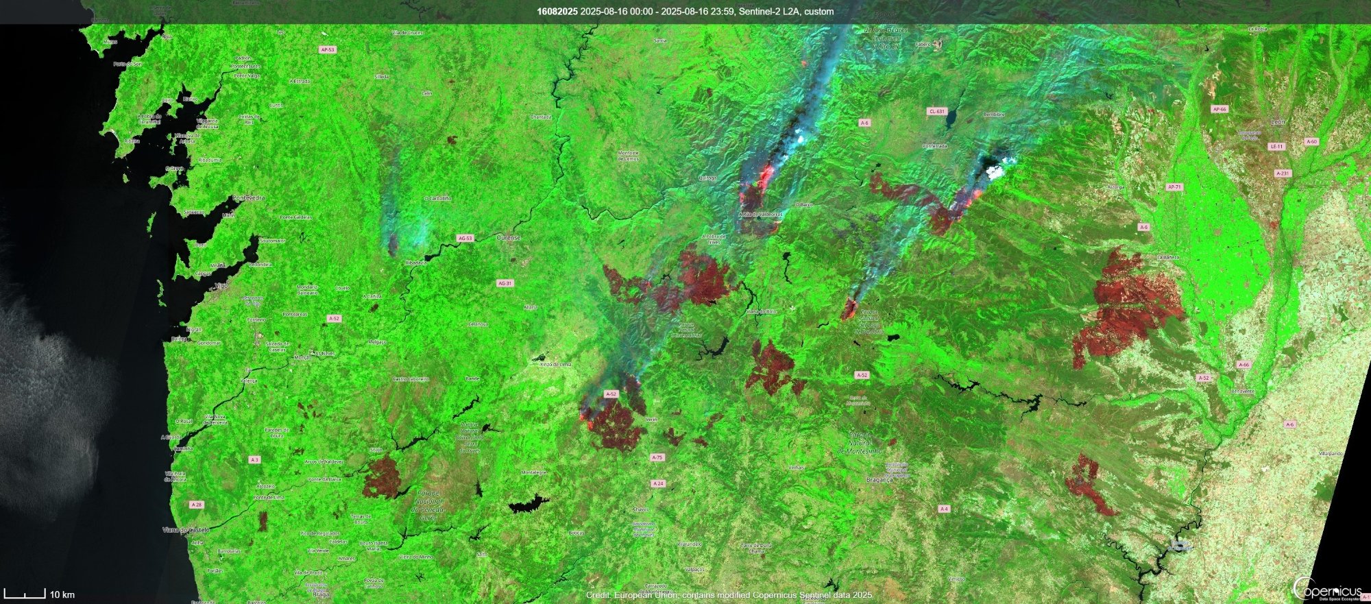 Obr. 5 RGB (12,8,4) produkt ze satelitu Sentinel 2 zachycující severní Portugalsko a severozápadní Španělsko ze 16. 8. 2025. Rozsah spálené plochy je zobrazen červeně