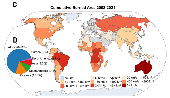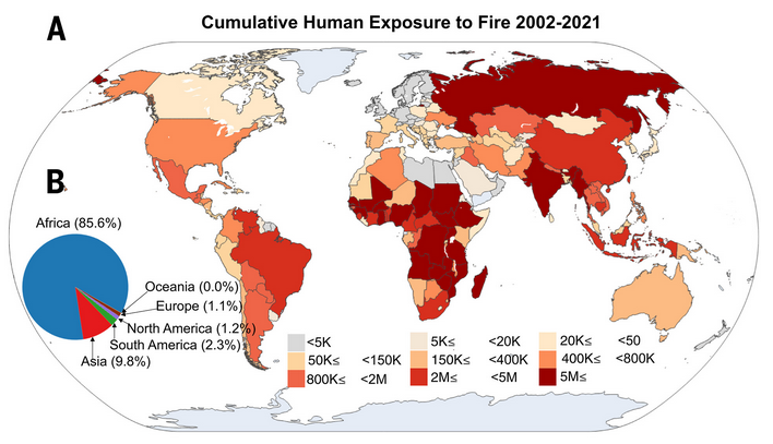 Kumulativní počet osob vystavených požárům za období 2002-2021 v jednotlivých státech světa (K=tisíc, M=milión lidí) a procentuální podíl v rámci jednotlivých kontinentů (koláčový graf vlevo)