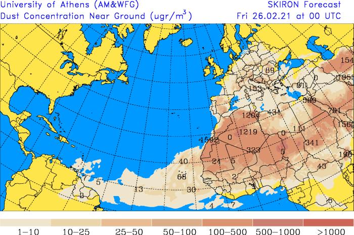 Předpověď množství prachových částic v blízkosti zemského povrchu pro 26. února 2021 prostřednictvím modelu SKIRON Athénské univerzity