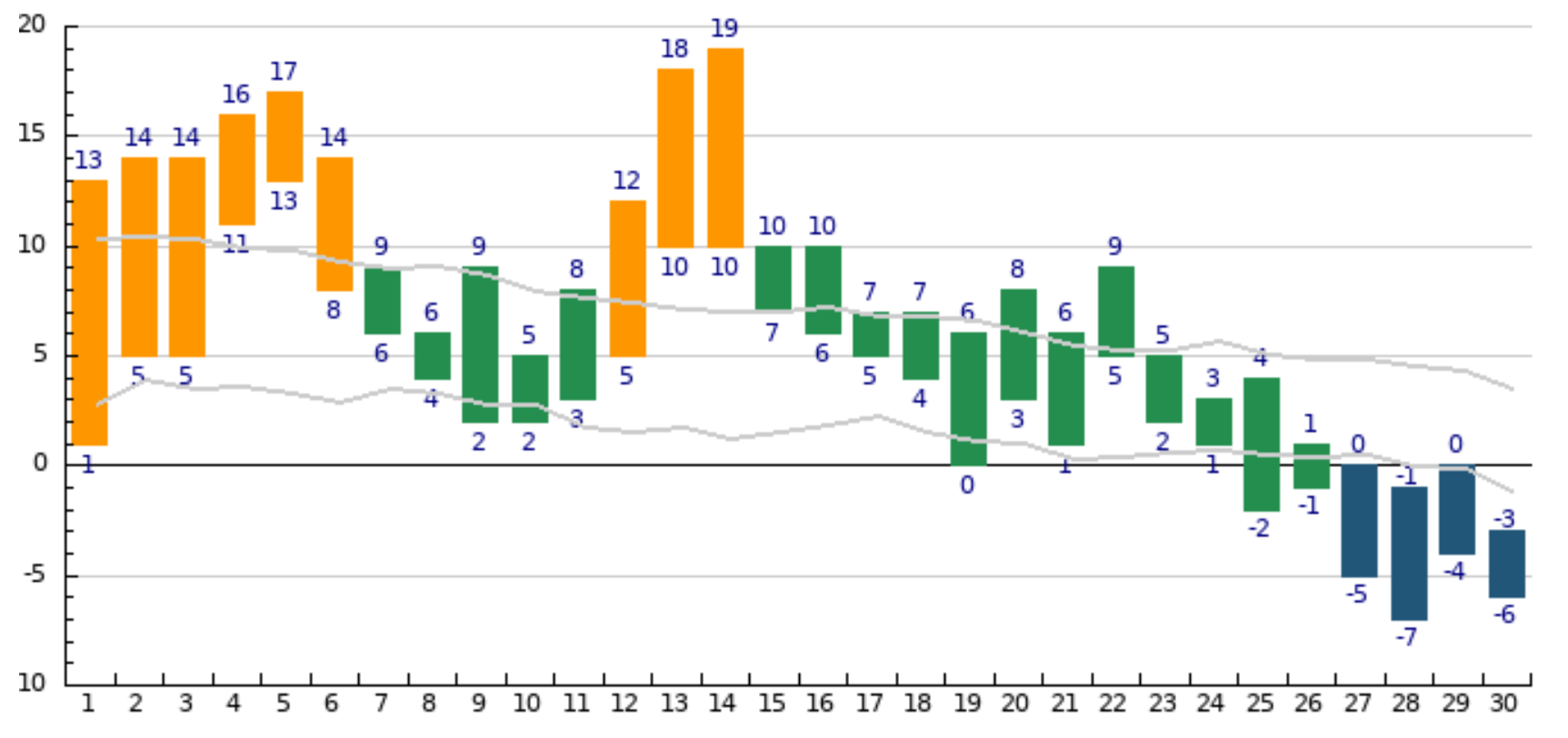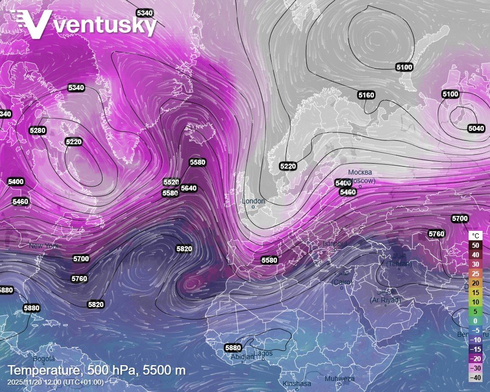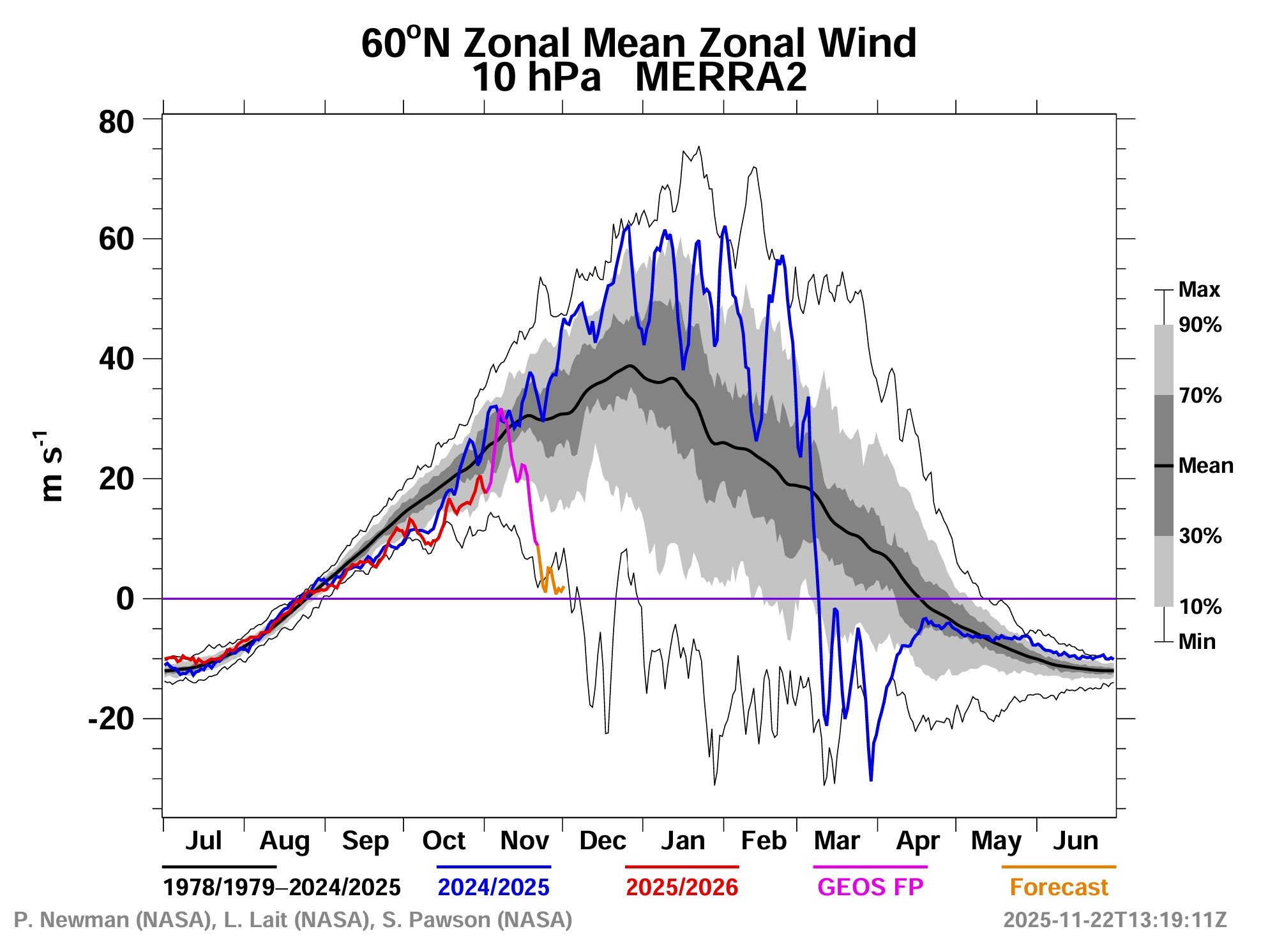Obr. 2 Průměrná rychlost zonálního větru na 60. rovnoběžce severní z. š. v tlakové hladině 10 hPa (přibližně 30 km) v letošní sezóně (červeně a růžově)
