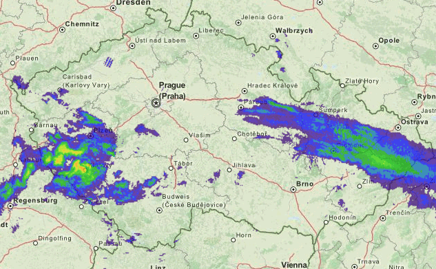 Obr. 2: Radarový snímek ze 2. prosince v 9:30 SEČ – tou dobou na severní Moravě mírně sněžilo, na západě Čech pršelo, padal déšť se sněhem i sníh, zdroj: ČHMÚ