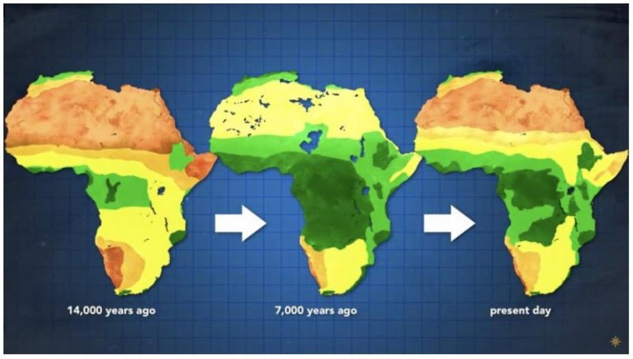 Během posledního glaciálního maxima (před cca 20 tisíci lety) byla Sahara tvořena rozsáhlými dunovými pouštěmi. Tyto pouště měly pravděpodobně větší rozlohu než dnes a řeky, jako například Bílý Nil, byly buď suché, nebo měly nižší průtok. Vlhčí období na Sahaře začalo asi před 14,5 tisíci lety současně s posledním interstadiálem Bølling–Allerød. V tomto období se vytvořily a dále rozšířily řeky a jezera (např. Čadské jezero), na hoře Kilimandžáro se díky vyšším srážkám rozšířily ledovce a poušť ustoupila (Obr. 2). V rámci tohoto vlhkého období došlo také k dvěma suchým výkyvům. První suchý výkyv nastal během mladšího dryasu. Mladší dryas je poslední období pleistocénu, které nastalo před 12,9 až 11,7 tisíci lety. Toto období představuje poslední stadiál, což je studenější a sušší klimatické období v rámci glaciálu. Druhý suchý výkyv nastal před 8,2 tisíci lety, kdy došlo k vylití proglaciálního jezera Agassiz do severního Atlantiku. Následně Africké vlhké období skončilo před 6 až 5 tisíci lety.