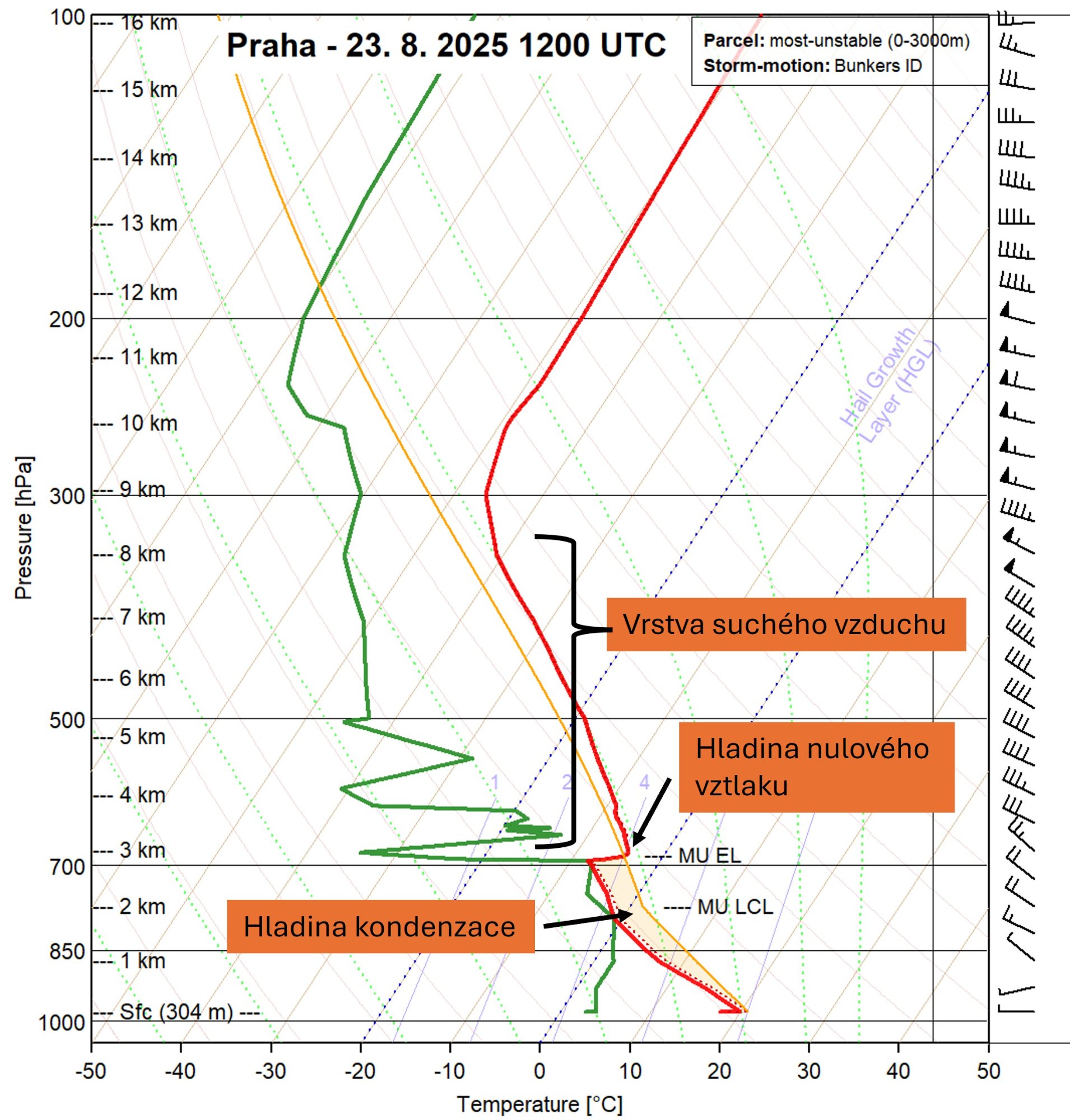 Obr. 3 Oblačnost a rozložení vzduchových hmot nad Evropou zachycené družicí MSG (produkt Air Mass RGB) 23. 8. 2025 ve 14:00 UTC