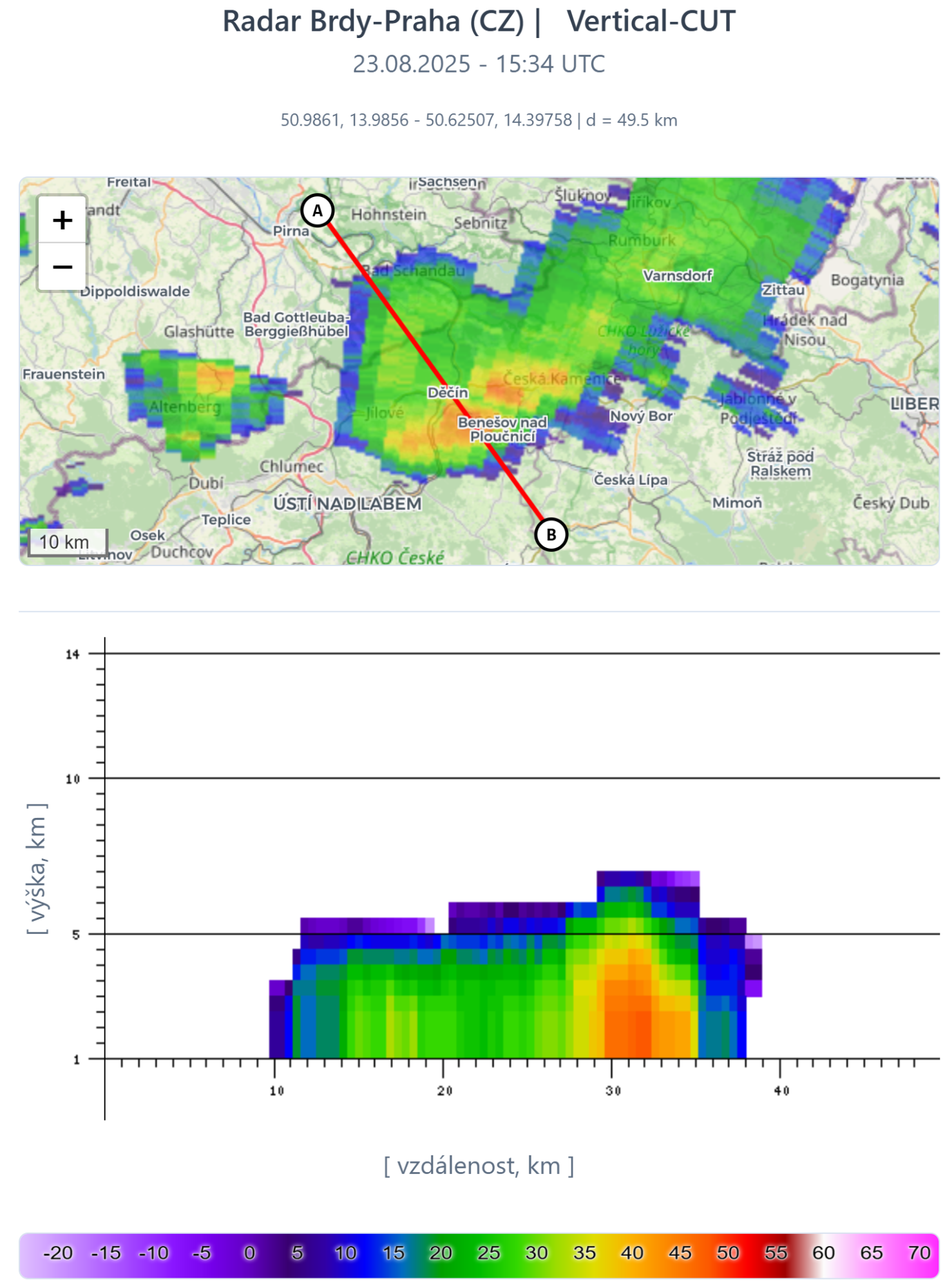 Obr. 5 Vertikální řez ojedinělou bouřkou v severozápadních Čechách