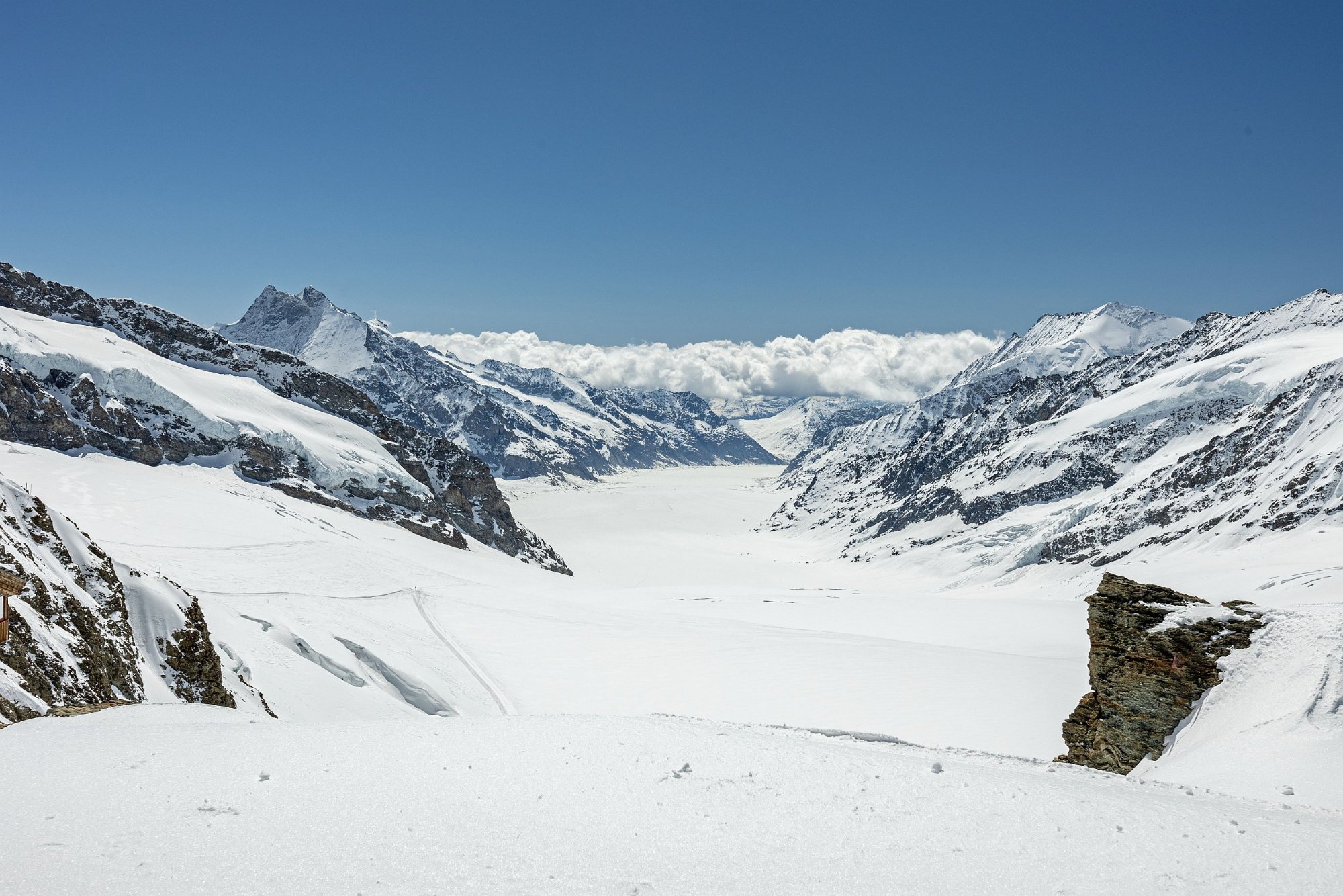 Masy sněhu pod vrcholem Mönch v květnu 2025 - zde se tvoří Aletschský ledovec