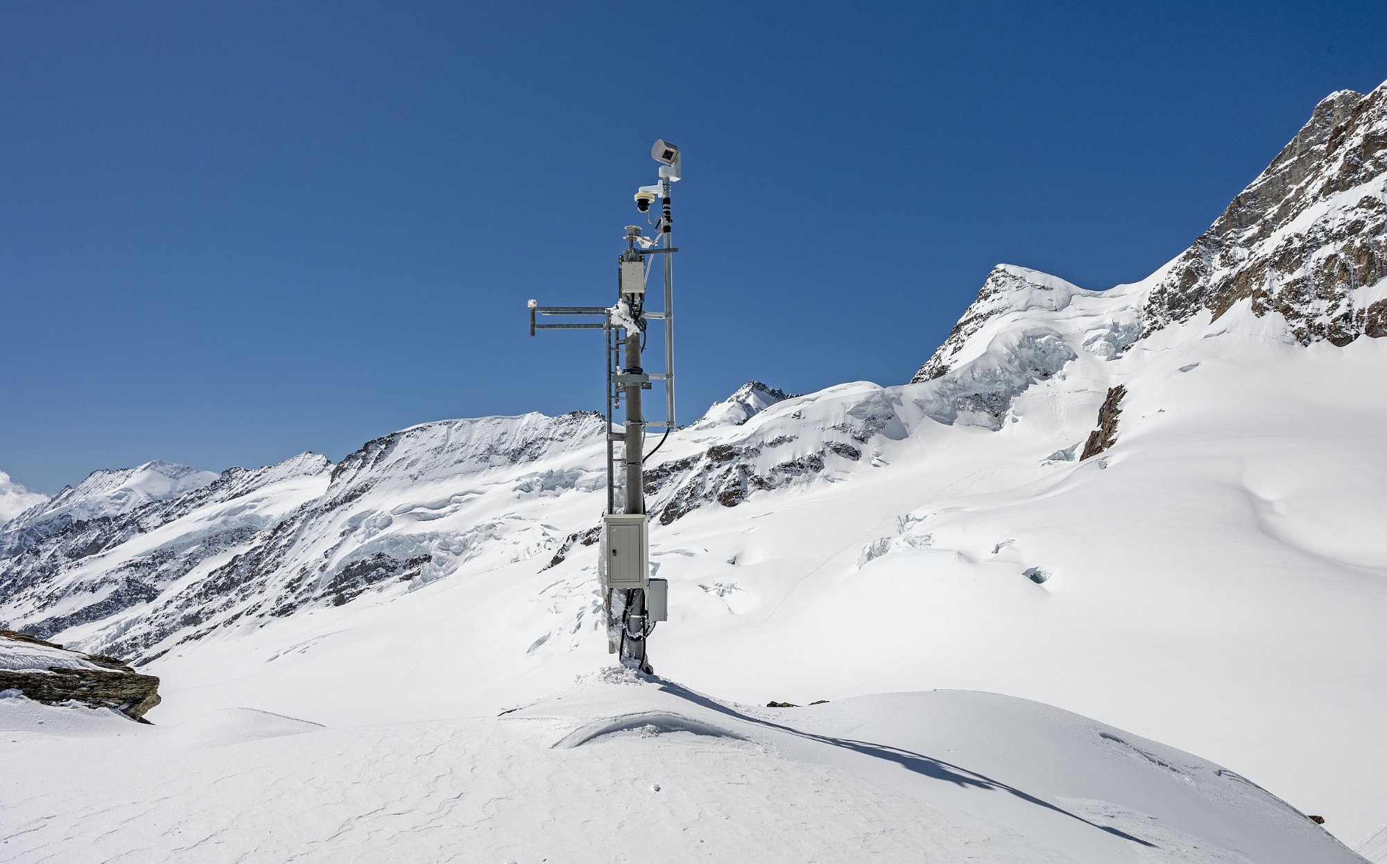 Masy sněhu pod vrcholem Jungfrau v květnu 2025 - v horní části ledovce je cca 150–200 m sněhu a ledu (v roce 1860 ho zde bylo ještě o cca 30 metrů více)