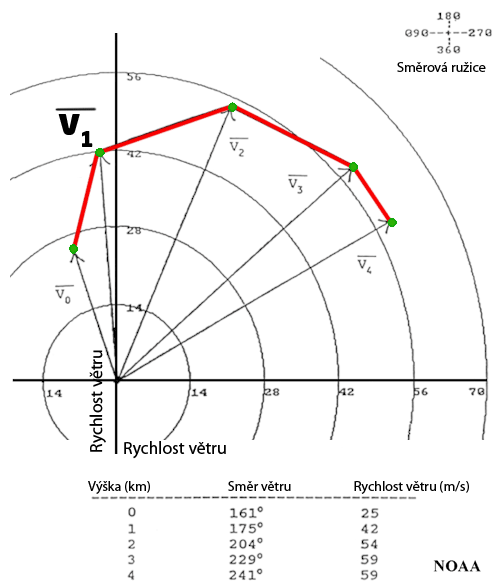 Obr. 2: Konstrukce hodografu – pro zvolenou hladinu je vektorem (šipkou vycházející z počátku do zeleného bodu) znázorněn směr a jeho velikostí pak rychlost větru (např. v hladině 1 km foukal vítr označený jako v1 rychlostí 42 m/s ze směru 175°, tj. téměř jižní vítr), následně pak koncové body těchto vektorů spojíme (červená čára). Případná supercela bude v takovém prostředí pravotočivá. Zdroj: NOAA.gov