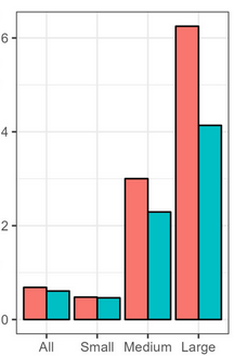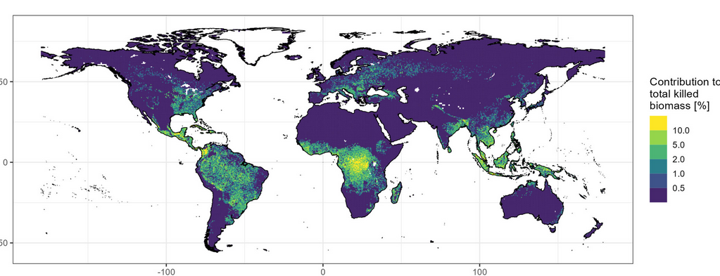 Procento stromů usmrcených blesky pro různé třídy velkosti stromů (všechny, malé (do 30 cm), střední (30-60 cm) a velké (nad 60 cm v průměru))