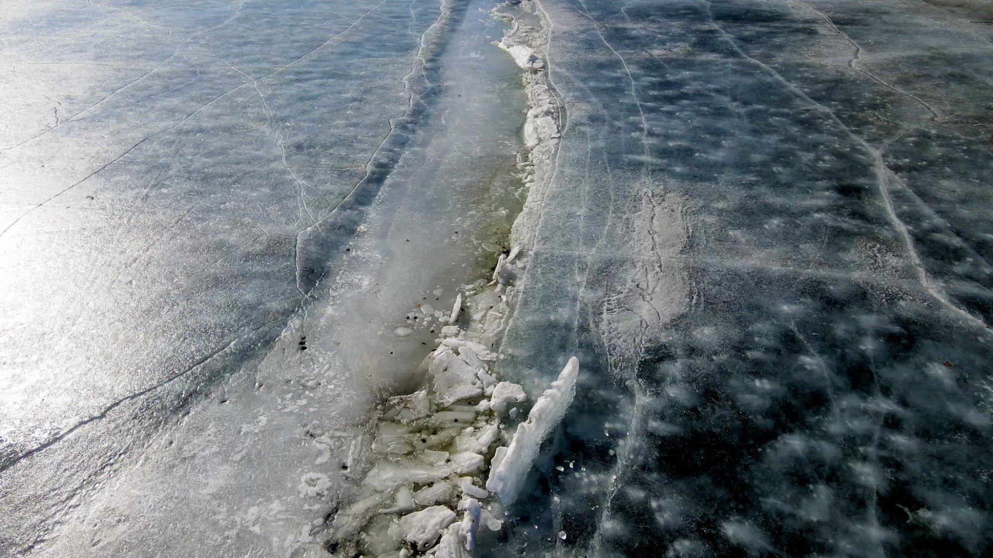 Potenciálně nebezpečný led s prasklinami a různou barvou i tloušťkou ledu