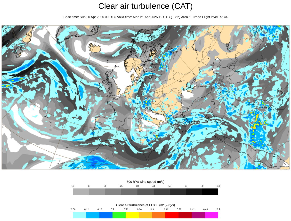 Předpověď rychlosti větru (odstíny šedi) a turbulence (barevně) v bezoblačném prostoru (způsobené střihem větru) na pondělí 21. 4. ve 12 hodin světového času (14 SELČ) podle modelu ECMWF v hladině 300 hPa (cca 9 km). Slabá turbulence je při hodnotách pod 0,22, mírná do 0,35, silná nad touto hodnotu
