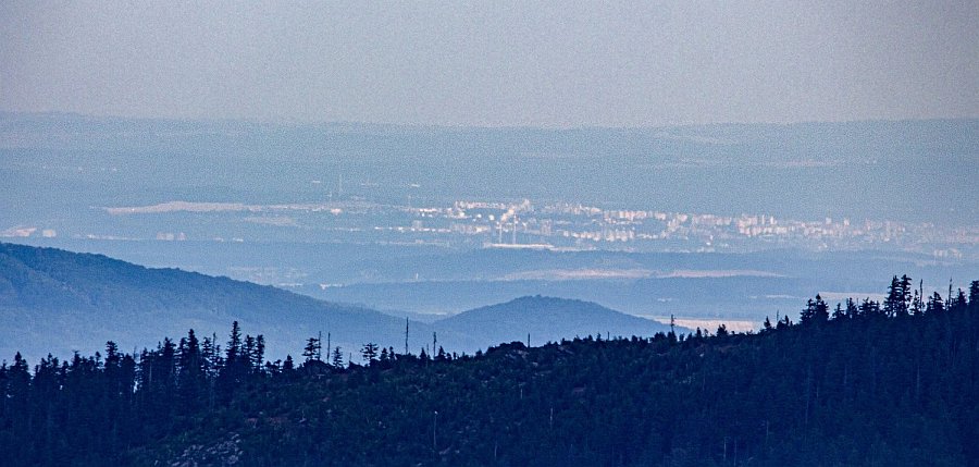 Pohled z Velkého Javoru na Plzeň - lehce patrné jsou panelové domy a komíny