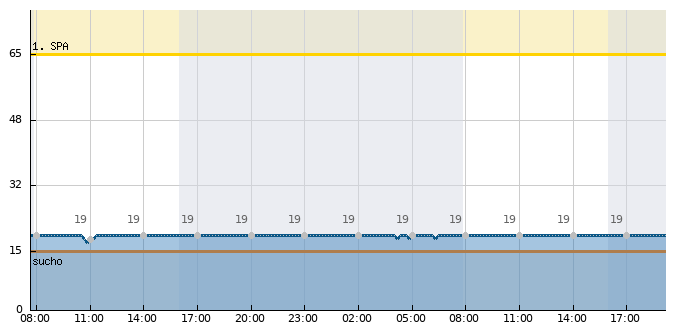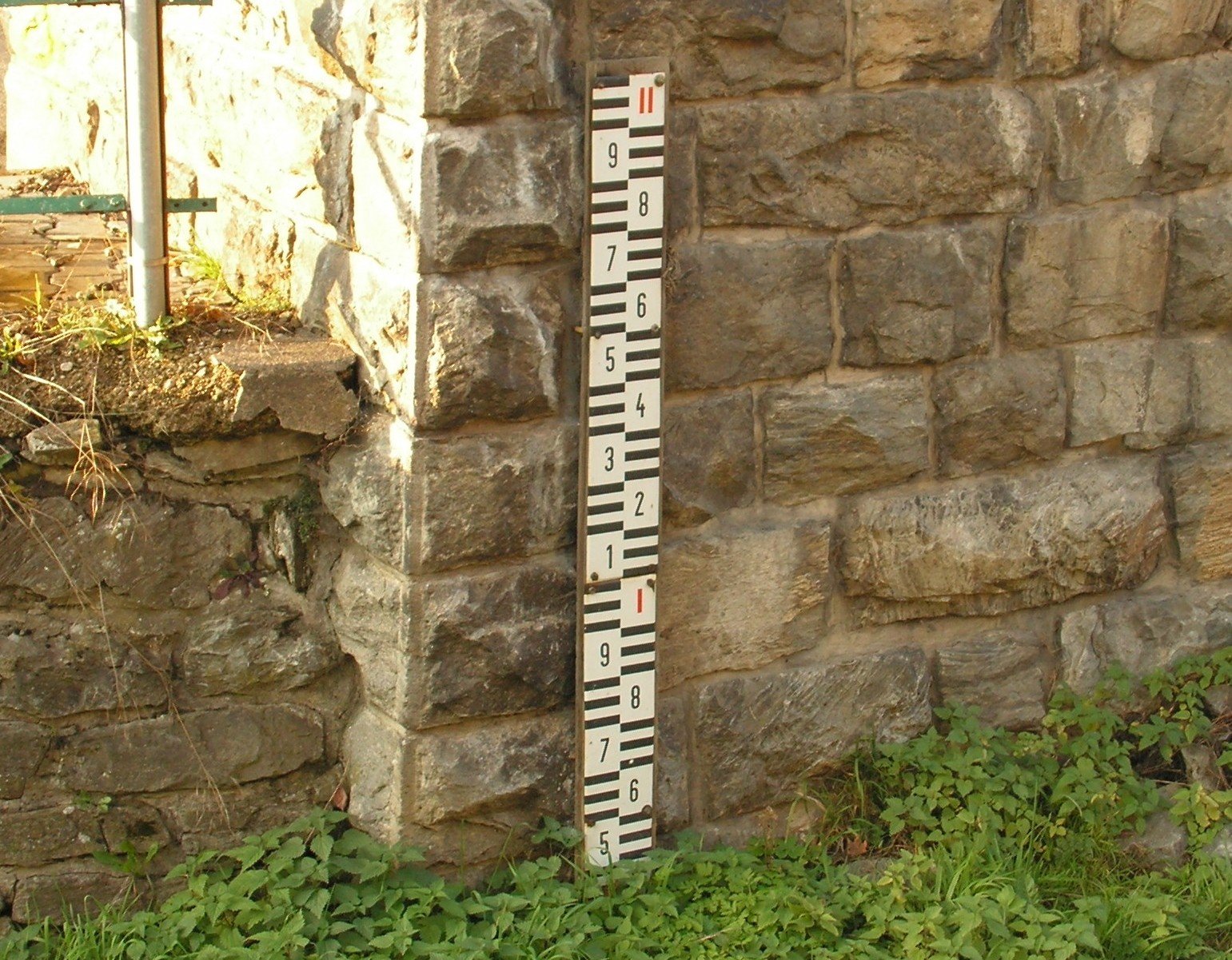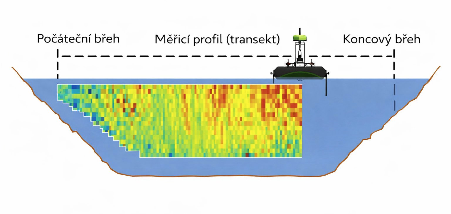 Princip měření průtoku akustickým průtokoměrem – loď pluje po hladině zleva doprava a měří na základě Dopplerova jevu rychlost částic proudící vody (barevně)