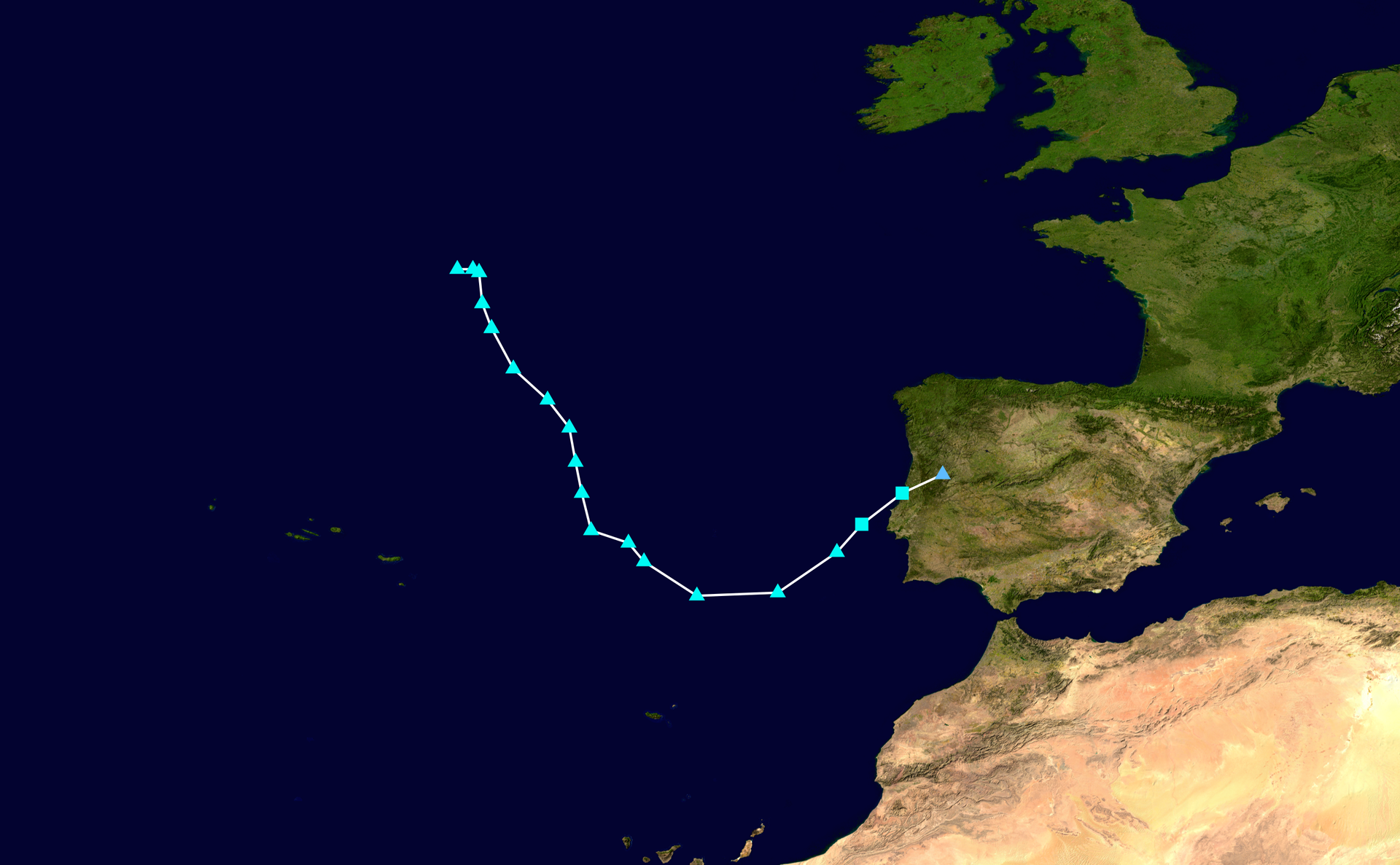 Postup subtropické bouře Alfa z Atlantiku přímo nad Portugalsko, kde se transformovala do níže