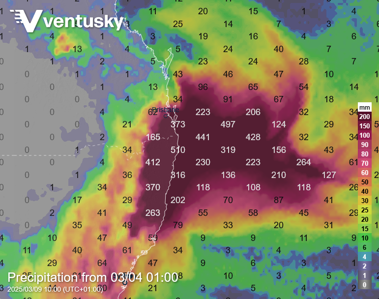Očekávané srážky na východním pobřeží Austrálie do konce týdne - jižně od Brisbane se čeká až 500 mm