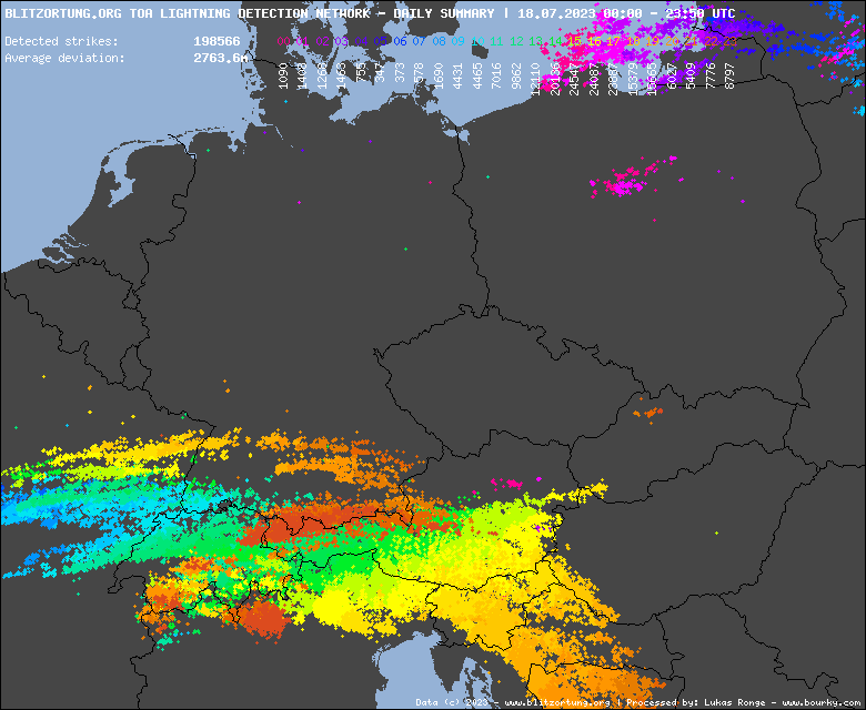 Sumace blesků za včerejší den - barevně odlišeno dle času