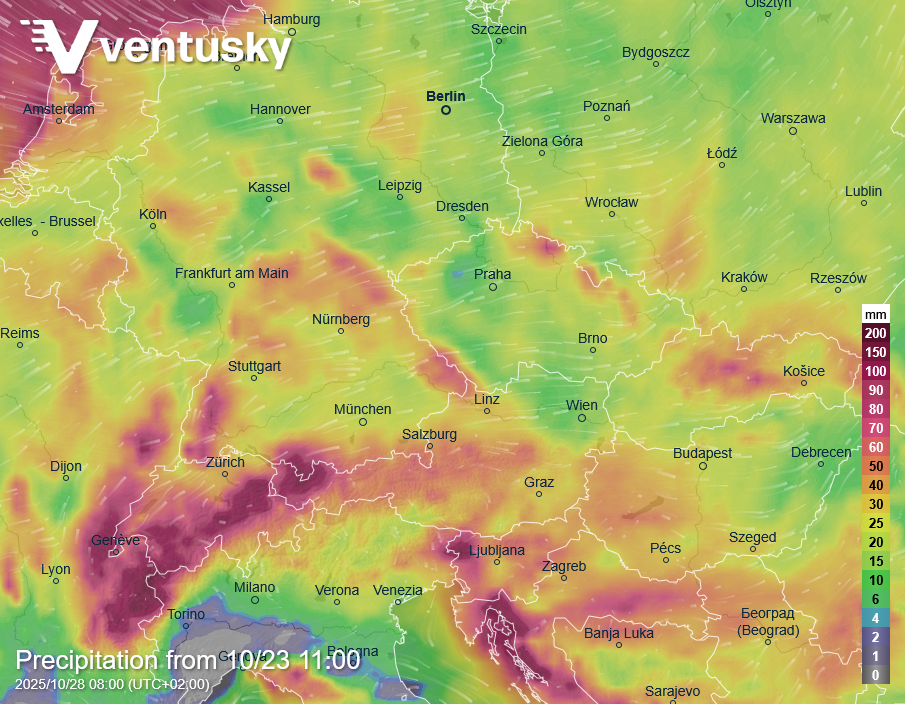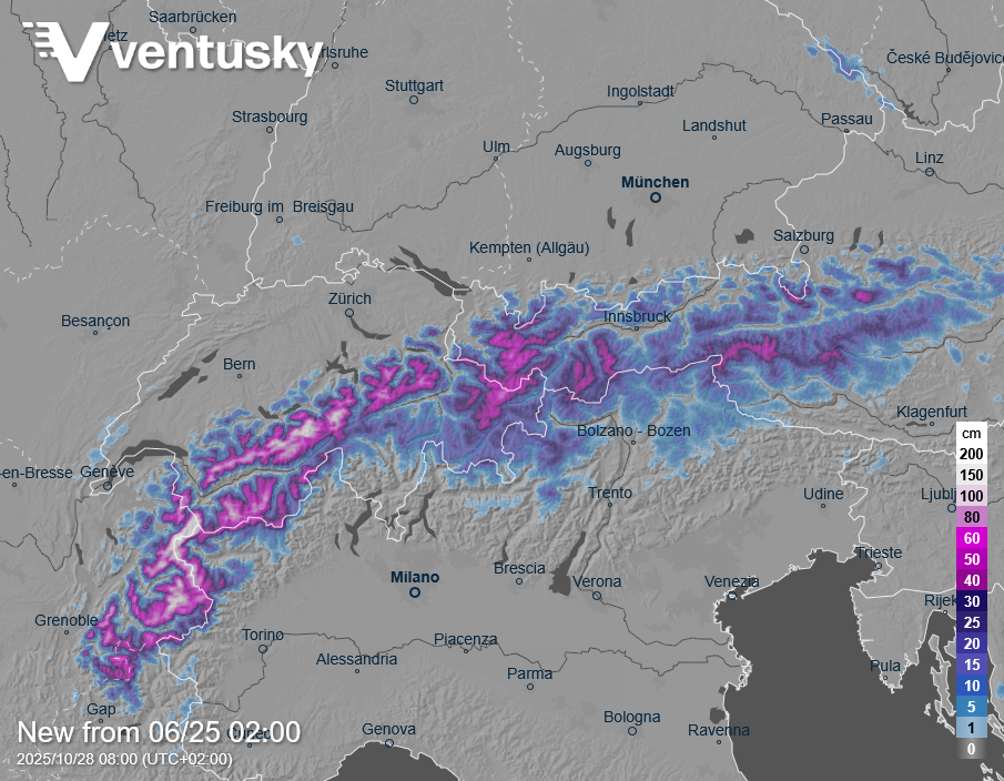 Množství nového sněhu v Alpách do úterního rána podle modelu ICON CH - na hřebenech to může být až kolem 1 metru