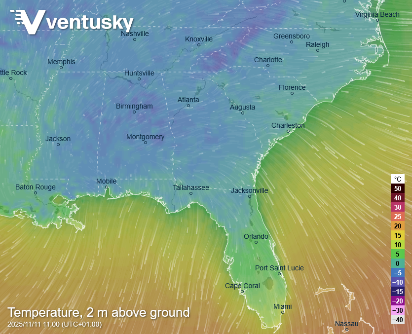 Zatímco na jihovýchodě USA bude úterní ráno velmi studené, v západní polovině Severní Ameriky lze čekat výrazně nadprůměrné teploty vzduchu