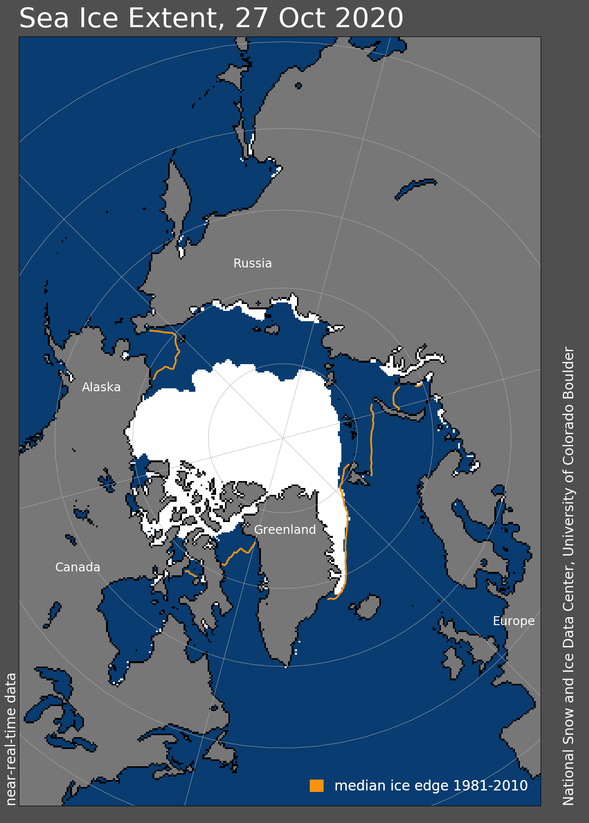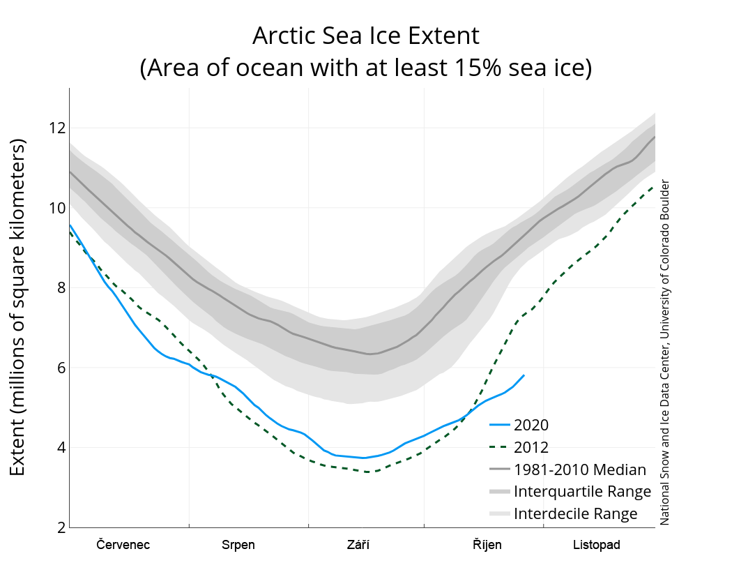 Aktuální rozsah mořského ledu a srovnání s mediánem (oranžově) za období 1981 až 2010