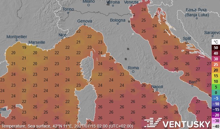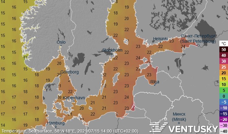 Teplota Baltského moře dnes ve 14:00 - dosahuje rekordních hodnot