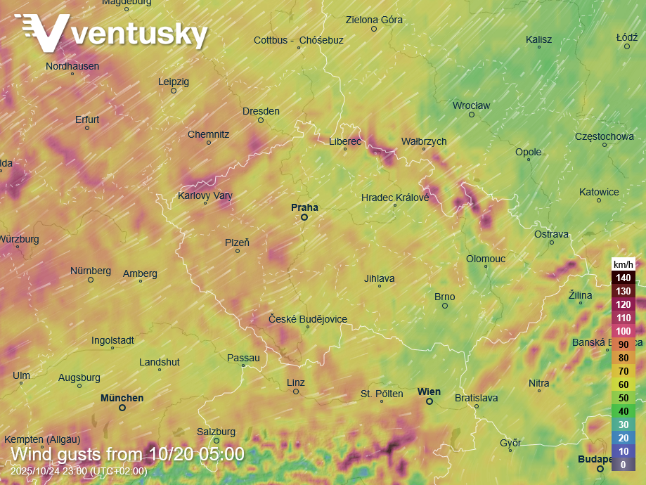 Očekávané maximální nárazy větru za čtvrtek a pátek