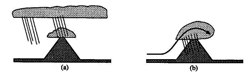 Obr. 2 Schematické znázornění popsaných procesů, které způsobují orografické zesílení vrstevnatých srážek. Na obrázku (a) je znázorněno zesílení srážek přirozenou infekcí a na obrázku (b) je pak znázorněna kondenzace při vynuceném výstupu
