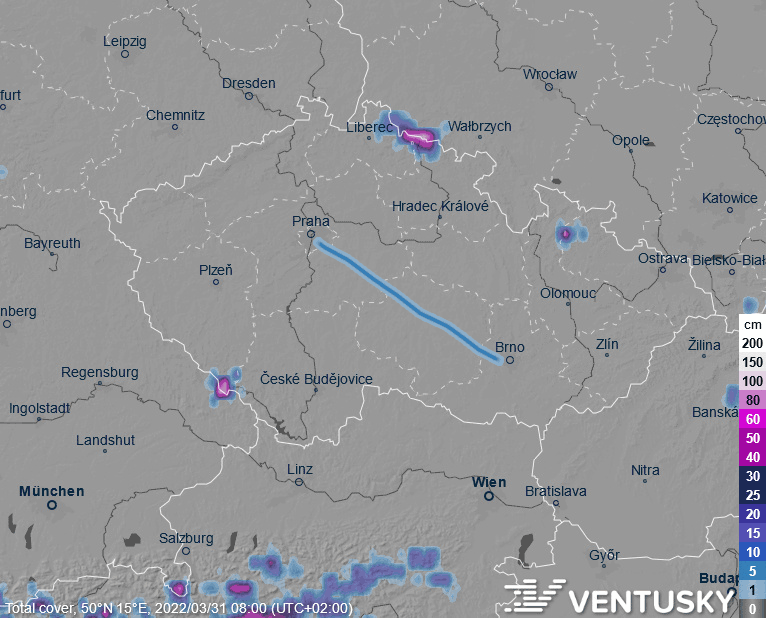Modelová simulace sněhové pokrývky v Česku v roce 2023 po realizaci projektu běžecké tratě mezi Prahou a Brnem – na trati by mělo trvale ležet mezi 10 až 20 cm sněhu