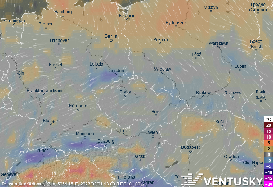 Odchylka teploty vzduchu ve středu odpoledne vůči průměru 1981-2020 - první březnový den do střední Evropy přinese normální teploty