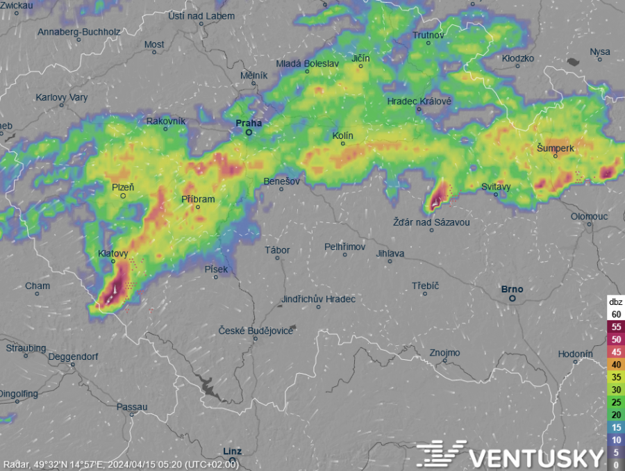 Radar v 5:20 - bouřky jižně od Klatov a severně od Žďáru nad Sázavou vykazovaly i znaky slabých supercel