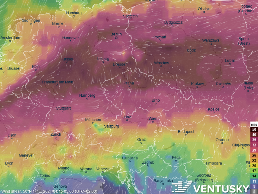 Hodnoty střihu větru dnes ráno - dosahovaly velmi vysokých hodnot, až 40 m/s, zdroj: ventusky.com