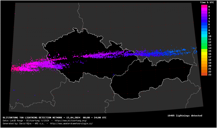 V noci na dnešek přes naše území začala přecházet zvlněná studená fronta. Na ní se ve druhé polovině noci začaly tvořit přeháňky a bouřky. Nejčastější byly v centrálním pásu Česka zhruba od Plzně po Ostravu. Jako první začalo bouřit na Plzeňsku. Potom se bouřky rozšiřovaly dále na východ.