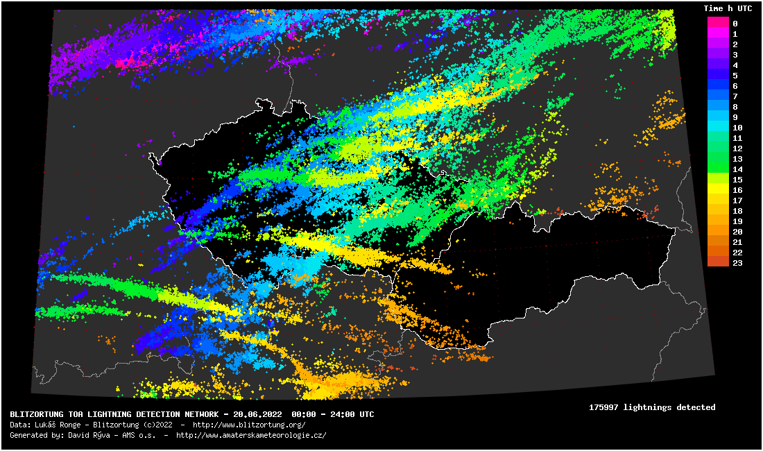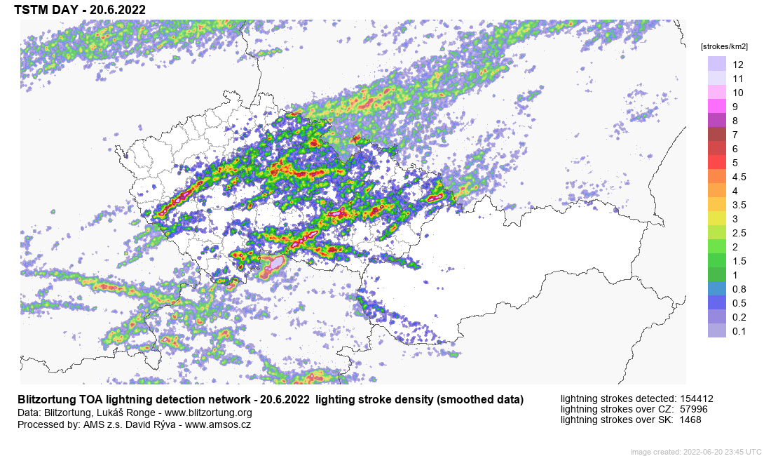 Intenzita blesků na km2 dne 20. června 2022 (fialovou jsou znázorněna místa, kde uhodilo nejvíce blesků)