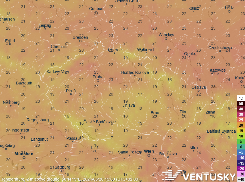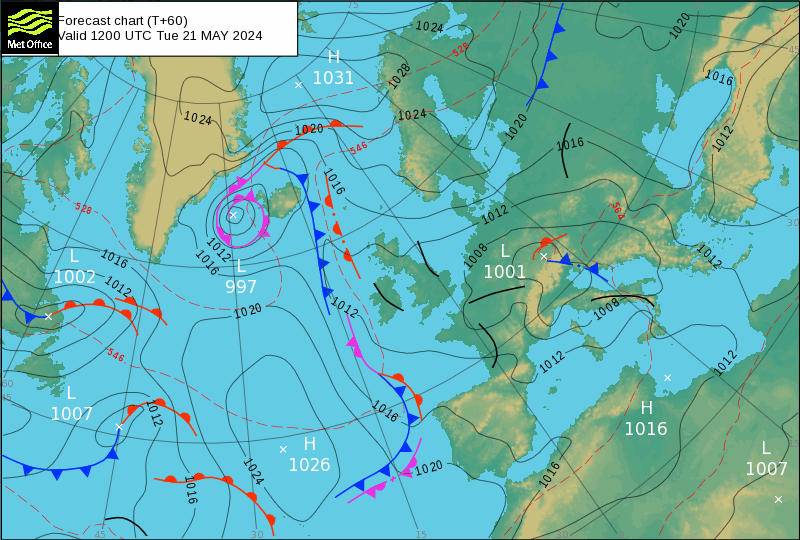 Synoptická situace v úterý v poledne - počasí ve střední Evropě bude ovlivňovat tlaková níže a s ní spojený frontální systém