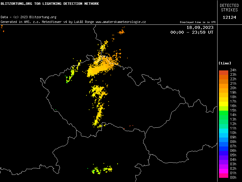 Množství blesků za včerejší den - barevně odlišeny dle času