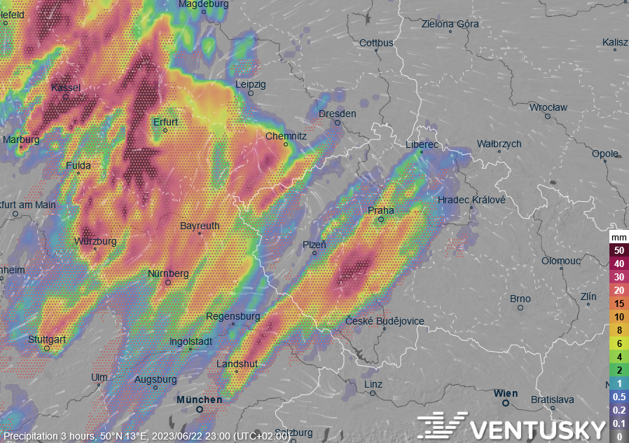 Predikce srážek z modelu ICON DE na zítřejší večer a noc - v severozápadní polovině našeho území model počítá s výskytem mohutného bouřkového systému